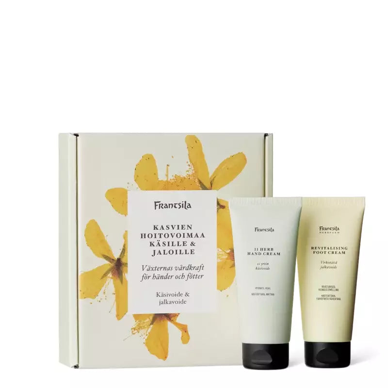 Käsi- ja jalkavoiteemme teho perustuu kasviuutteisiin, joiden raaka-aineet kerätään Frantsilan omilta luomupelloilta Hämeenkyrössä. Tämä kahden huippulaadukkaan tuotteen kombo sopii lahjaksi monelle.